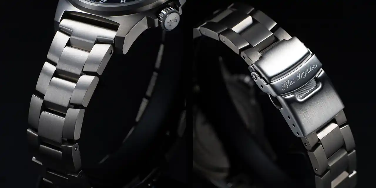 ケースとブレスレットには、ブルーインパルス現行機 T-4 にも使用されているチタン素材を採用。ステンレス比で約40%の軽量性と約2倍の強度を誇り、アレルギーレスの快適な装着感を実現します。ケース径は扱いやすい39mm。 |