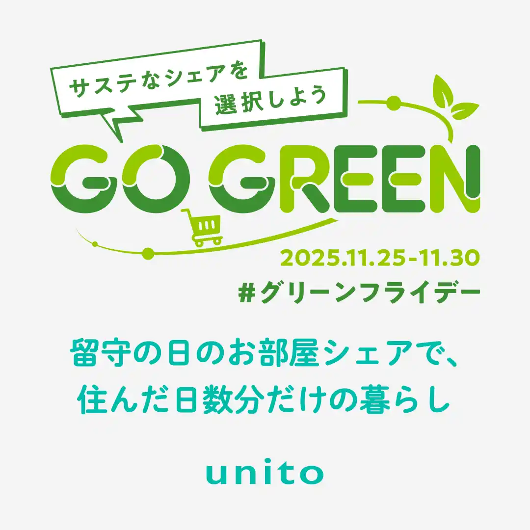 帰らない日は家賃がかからない住まい「unito」を提供する、株式会社Unito(本社:東京都目黒区、代表取締役:近藤佑太朗、以下当社)は、欧州を中心に広がるサステナブルな消費を促す「グリーンフライデー(※1)」(2025年11月28日)に合わせ、一般社団法人シェアリングエコノミー協会シェアサービス事業者19社(20サービス)と共に「GO GREENプロジェクト」を行うことをお知らせします。 |
