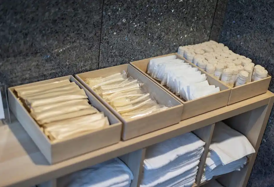 アメニティをフロントに設置することで「ユーザーが必要な時に必要な分だけ」ピックアップできる仕組みを採用しています。この取り組みにより、廃棄物削減や環境負荷の軽減を実現するとともに、持続可能かつエシカルな消費行動を自然に意識することを目指しています。またゲストが24時間自由にピックアップできることで、個々のライフスタイルに応じた柔軟なサービスも可能にしています。 |