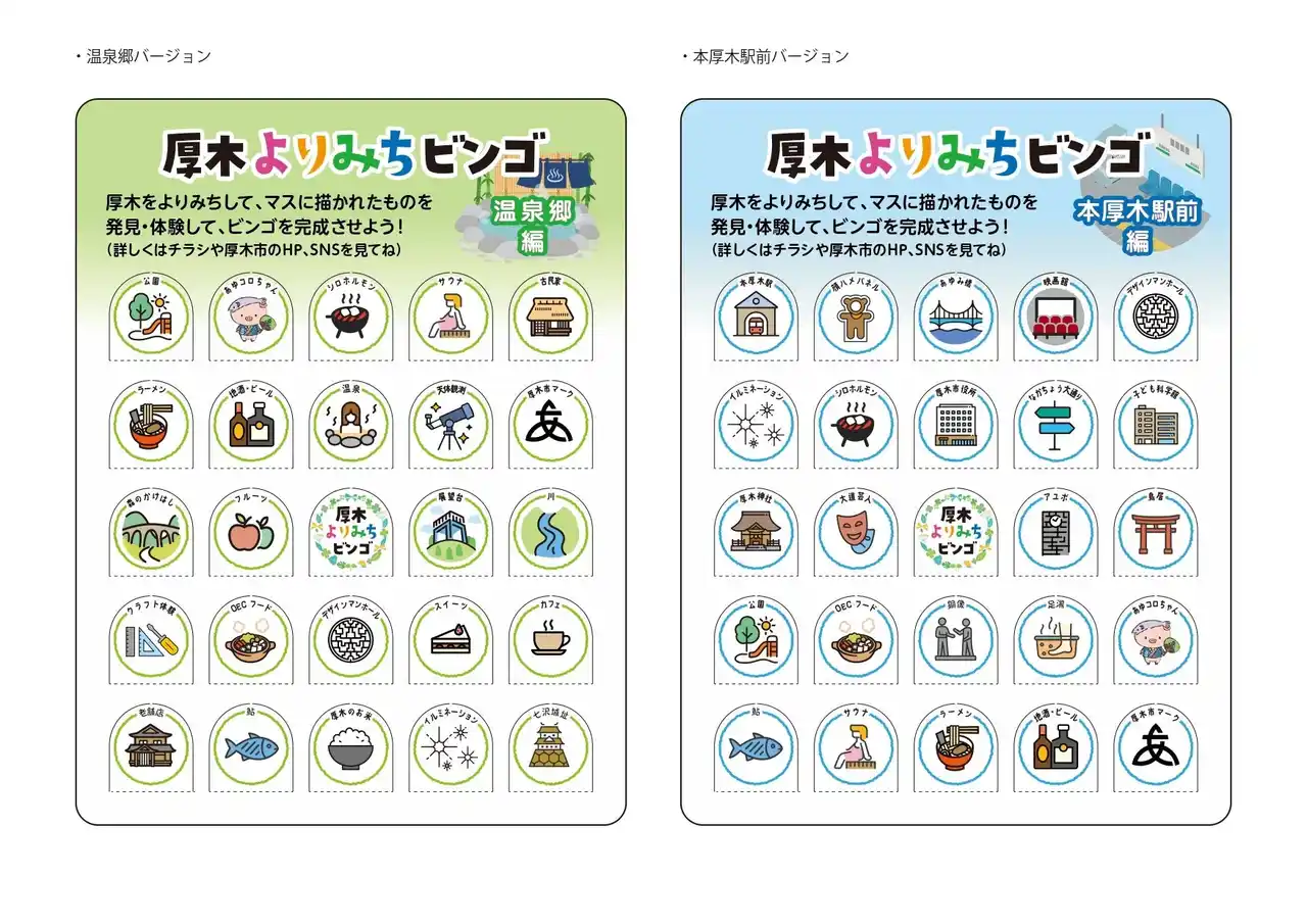 | 本企画では、参加者がビンゴゲームを楽しみながら、普段は通り過ぎてしまう場所や、食べたことのないグルメ、知らなかった文化に「ちょっと“よりみち”」する。「発見」と「体験」を通じて、厚木市の魅力を改めて感じ、街への愛着を深めていただきたいと思います。 | |||||||||