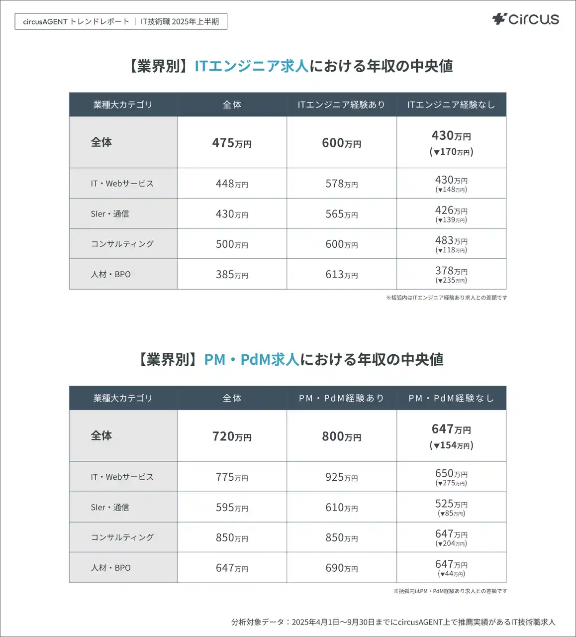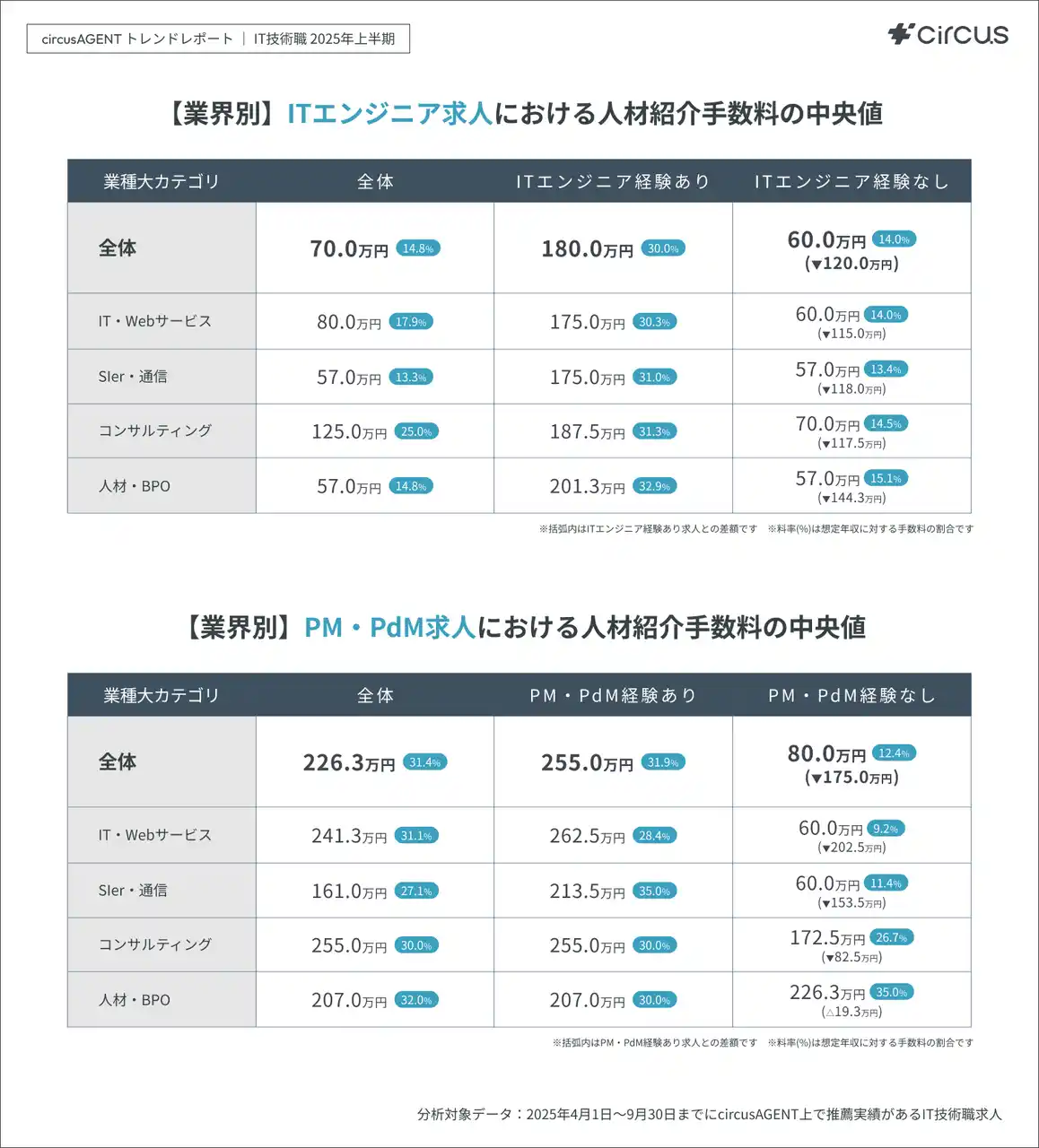 分析対象 circusAGENT上で2025年4月1日~9月30日の期間内に推薦実績があるITエンジニア、PM・PdM求人 |