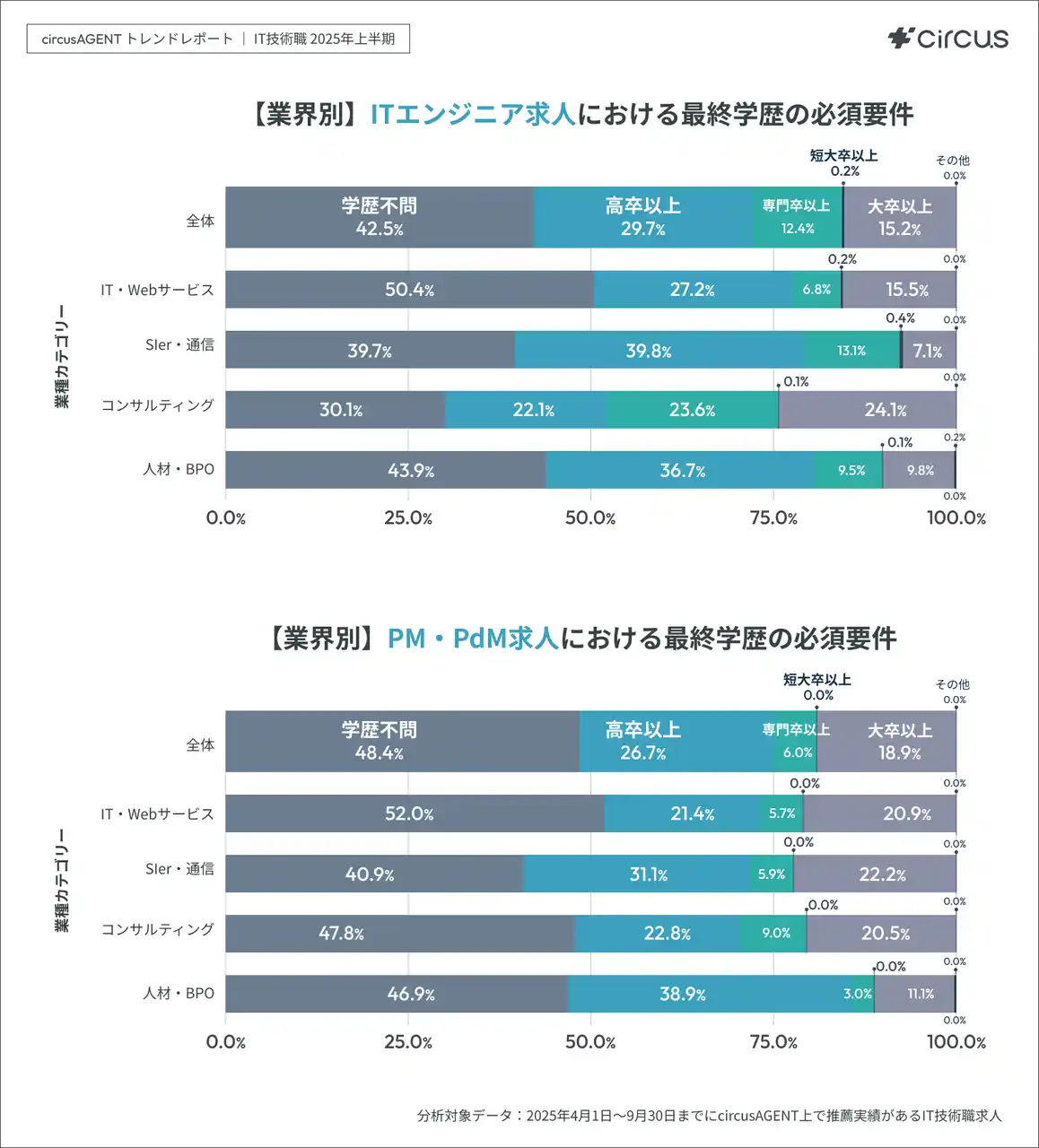 IT・Webサービス業界では、ITエンジニア職(学歴不問:50.4%)、PM・PdM職(学歴不問:52.0%)ともに学歴不問の比率が5割を超えており、学歴よりもスキルを重視する採用傾向が推察されます。 |