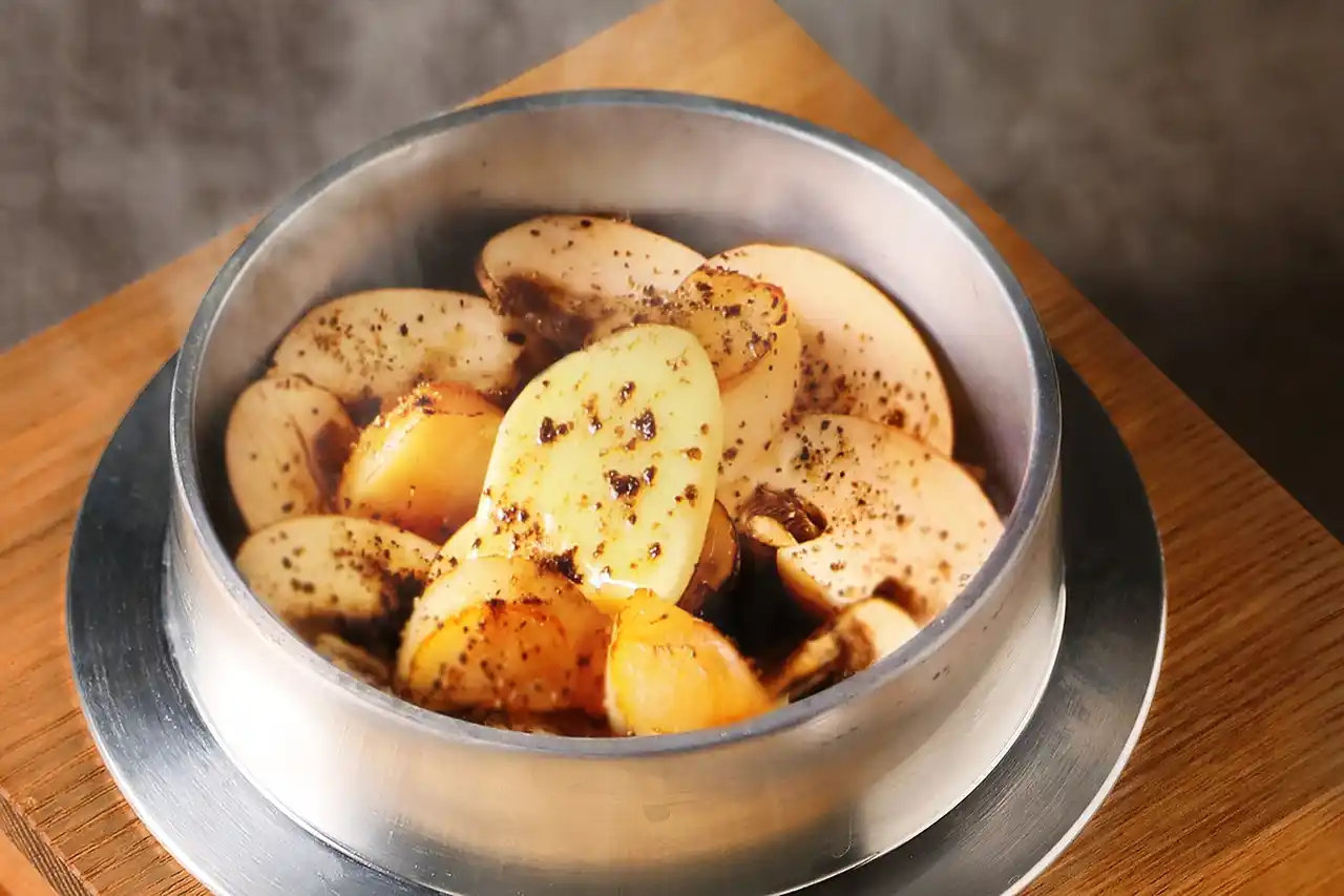 肉厚な舟形マッシュルームの旨みと香りがじんわりとしみ込む、きのこ好きにはたまらない一釜。そこへふっくら肉厚な北海道産帆立を合わせ、仕上げにバター、トリュフをまとわせることで豊かなコクと余韻を添えました。蓋を開けた瞬間に広がるきのことトリュフの芳しい香りは、冬の夜に似合う贅沢なごちそう。お酒とも相性のよい黒十らしい季節限定の香り高い釜飯です。 |