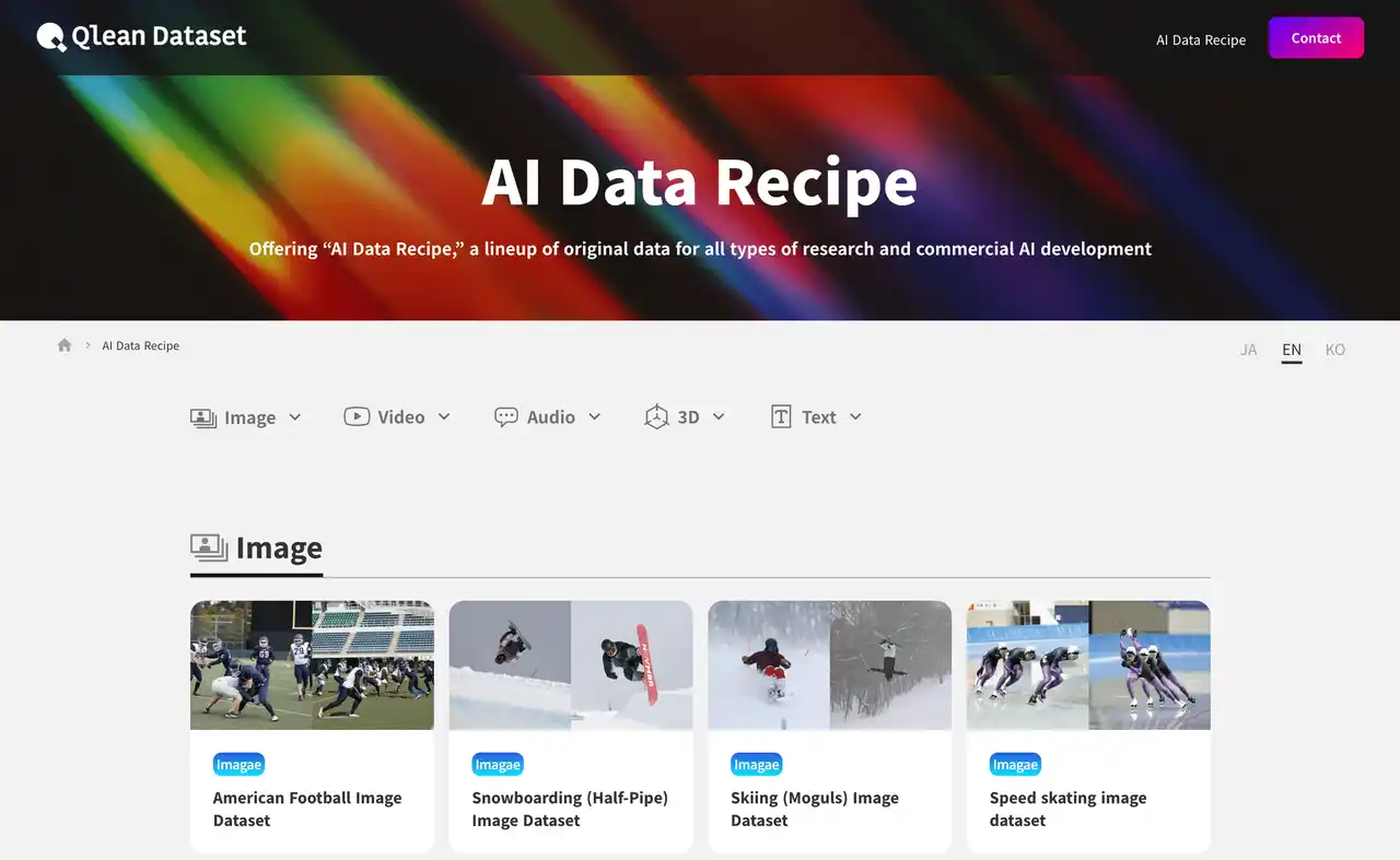 Qlean Dataset is a commercial-use-ready AI training data solution provided by Amana Images Inc., a subsidiary of Visual Bank Inc. It supports diverse data types including images, videos, audio, 3D, and text-enabling both research and commercial AI development in a legally safe environment. |