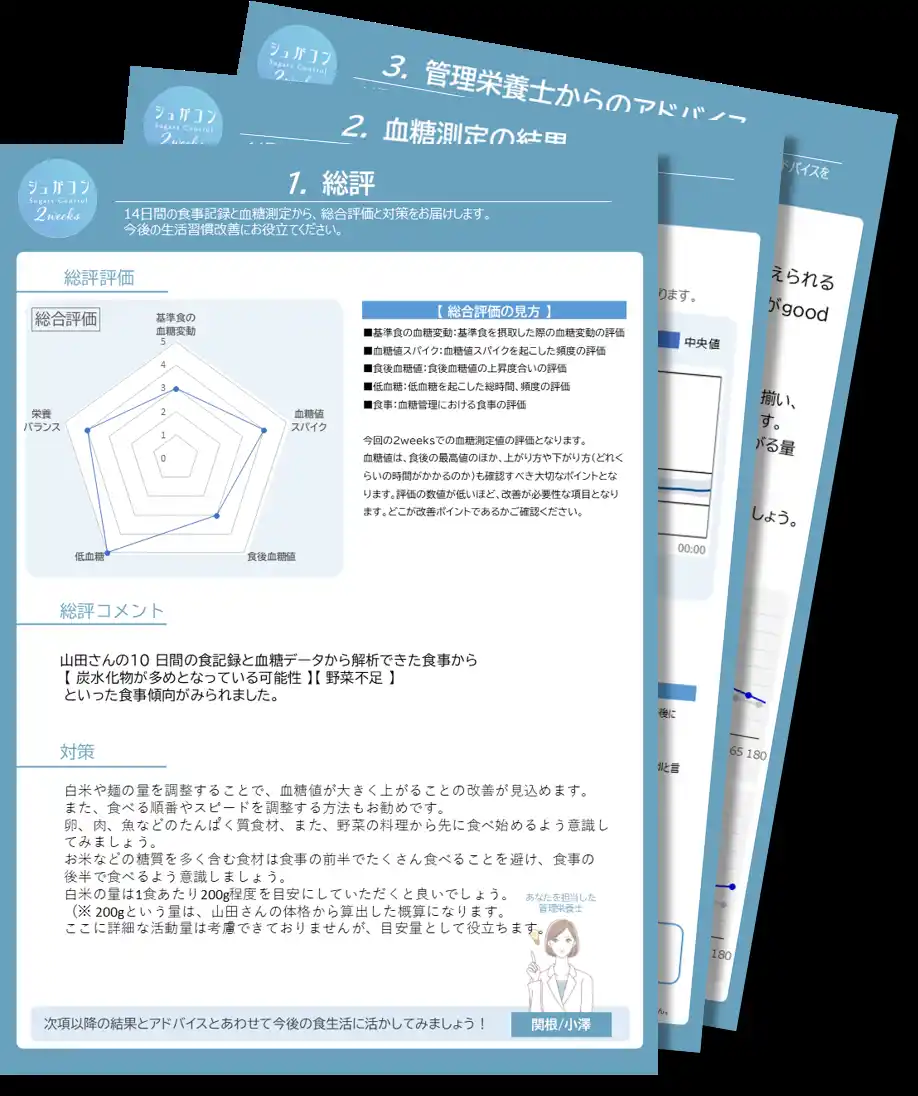 これまで診療現場では、空腹時血糖などの限られた数値による評価が中心でしたが、『シュガコン2weeks』を導入することで、日常生活における血糖のリアルな変動と食生活の関係性を可視化できるようになります。 |
