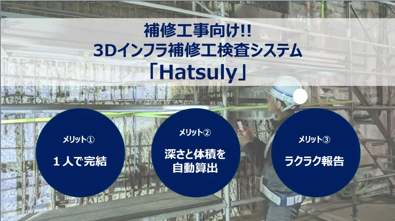| 「Hatsuly」は、道路構造物の補修工事における、調査や表面被覆工や剥落防止工の出来形検査、断面修復工における出来形検査など、インフラ補修における検測を効率化するシステムです。 | ||||||||||||