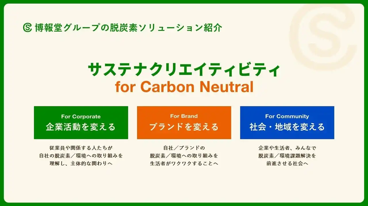 株式会社博報堂プロダクツ(本社:東京都江東区、代表取締役社長:橋本 昌和)は、博報堂グループ横断で企業の脱炭素化や環境課題解決を支援する統合ソリューション「サステナクリエイティビティfor Carbon Neutral」の提供を開始いたします。本ソリューションは、博報堂グループ内のサステナビリティ領域における各分野の専門性を持つグループ会社および専門組織と連携して提供し、企業の戦略策定から社会実装までを一気通貫で支援します。 |