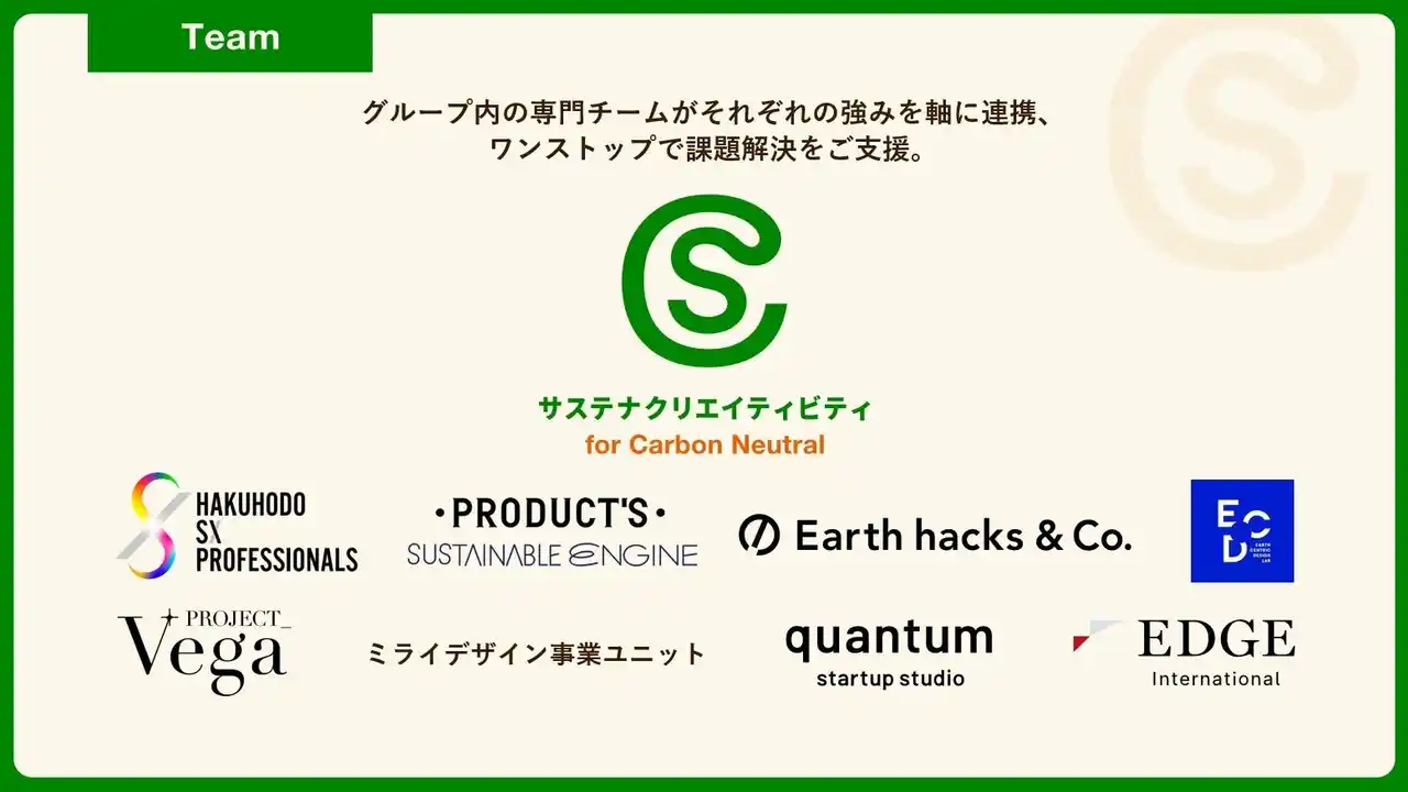 「博報堂SXプロフェッショナルズ」「博報堂プロダクツ サステナブルエンジン」「Earth hacks」「地球中心デザイン研究所」「PROJECT_Vega」「ミライデザイン事業ユニット」「quantum」「エッジ・インターナショナル」など、サステナビリティ領域における各分野の専門性を持つグループ会社および専門組織等が連携し、戦略策定から社会実装まで支援します。 |