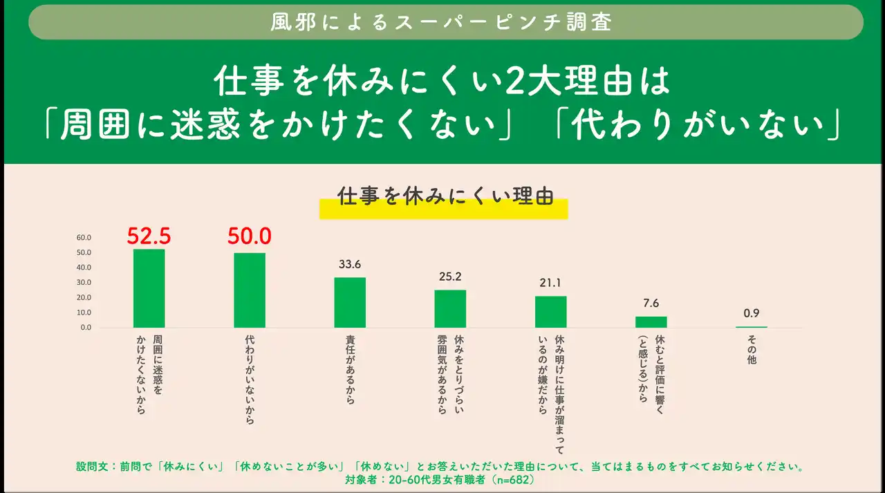 第二弾となる今回は、ビジネスパーソンが風邪を引いた時に、どの程度の方が実際に休みを取得できているのかを調査で明らかにしました。結果からは、半数以上のビジネスパーソンが“休みにくい”と感じており、“周りに迷惑をかけてしまうのでは?”や“代わりがいない”などの理由から休みを取得しにくい状況が垣間見えました。 |