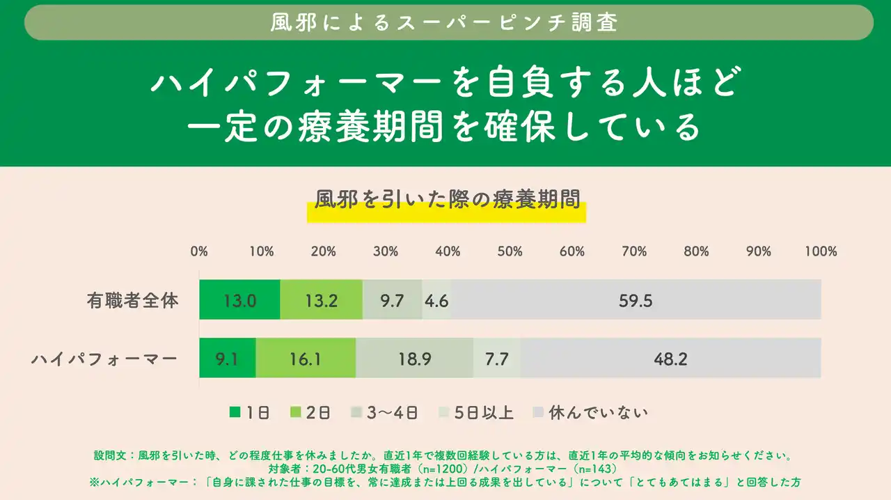 有識者全体では約6割(59.5%)は仕事を休まないがハイパフォーマーを自負する人の51.8%が一日以上療養期間を確保している! |