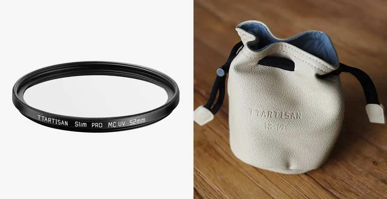 TTArtisan 56mm F1.8 AF 単体は、UVフィルター1枚 + ポーチ1個 |