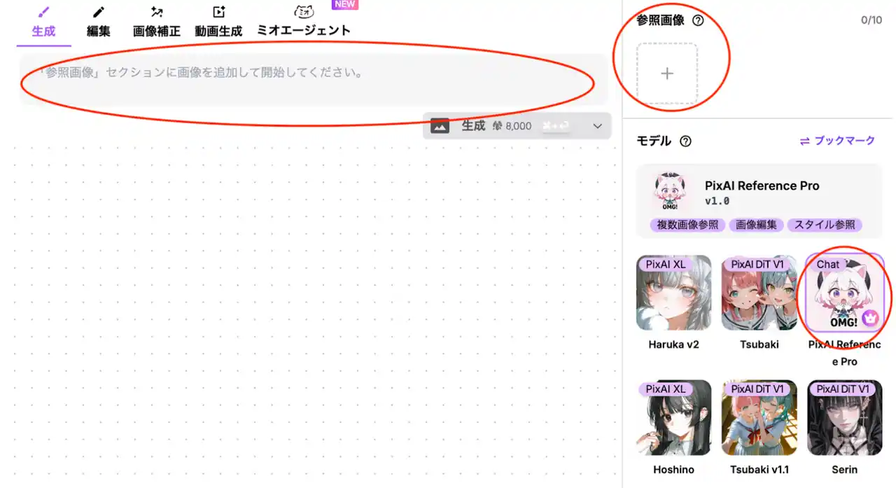 使い方は生成画面でPixAI Reference Proを選択した状態で、参照画像を任意の枚数アップロードし、それに対するプロンプトを入力するだけです。赤丸で囲った部分の操作だけで簡単にご利用いただけます。 |