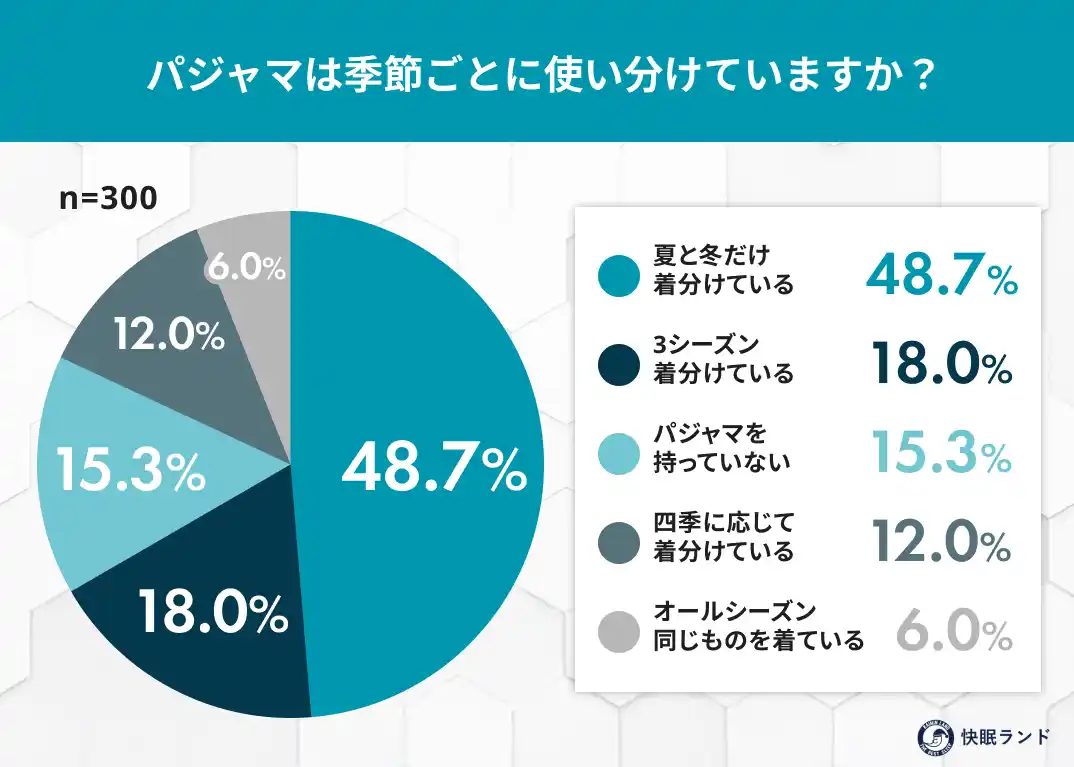 今回の調査を通して、パジャマが睡眠の質を左右する大切な寝具として、生活の中に根付いていることが分かりました。季節ごとに素材や厚みを変えることで体温調節がしやすくなり、結果的に眠りの深さにも影響します。また、複数枚を持つことで天候や洗濯サイクルに左右されず、快適な状態を保てます。パジャマは特別なものではなく、日々の睡眠を整えるための“身近な投資”といえるでしょう。快眠ランドでは今後も、忙しい現代の生活に寄り添いながら、快適な睡眠環境づくりを後押しする情報を発信してまいります。 |