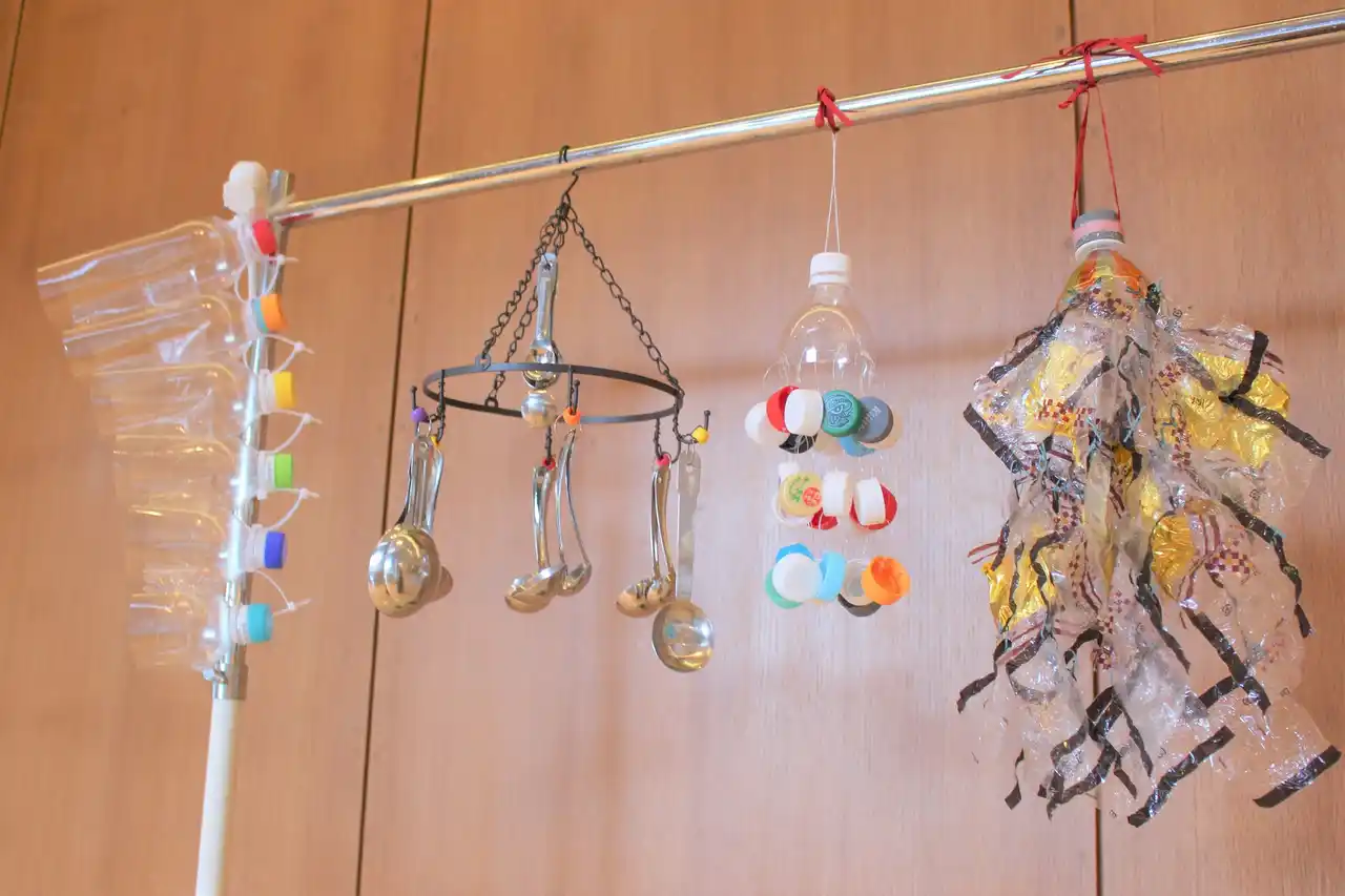 高浜市内で回収された資源ごみを使った手づくり楽器と、茶碗や湯飲みなどを並べたkajiiオリジナル楽器「食琴(しょっきん)」を設置。来館者が自由に演奏できる。(設置場所:本館1階ロビー) |