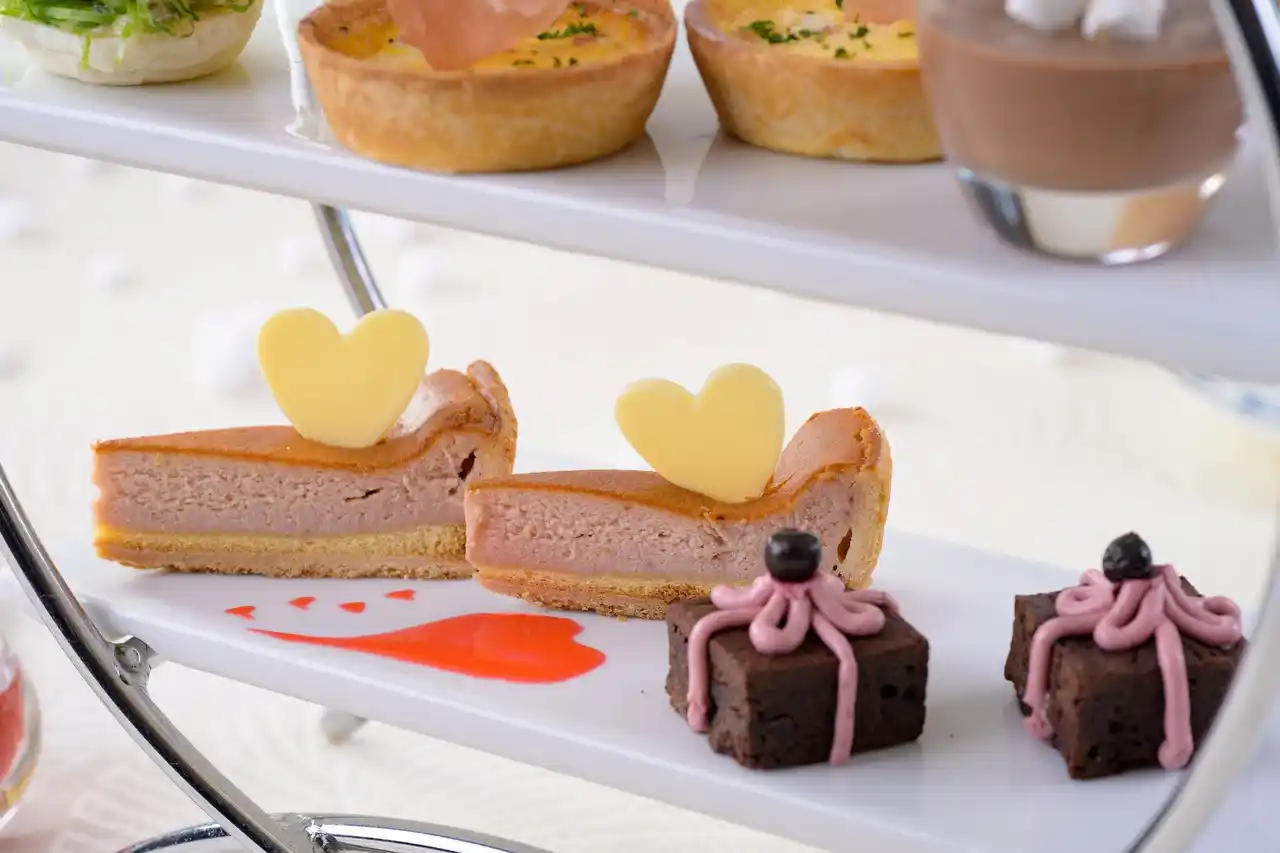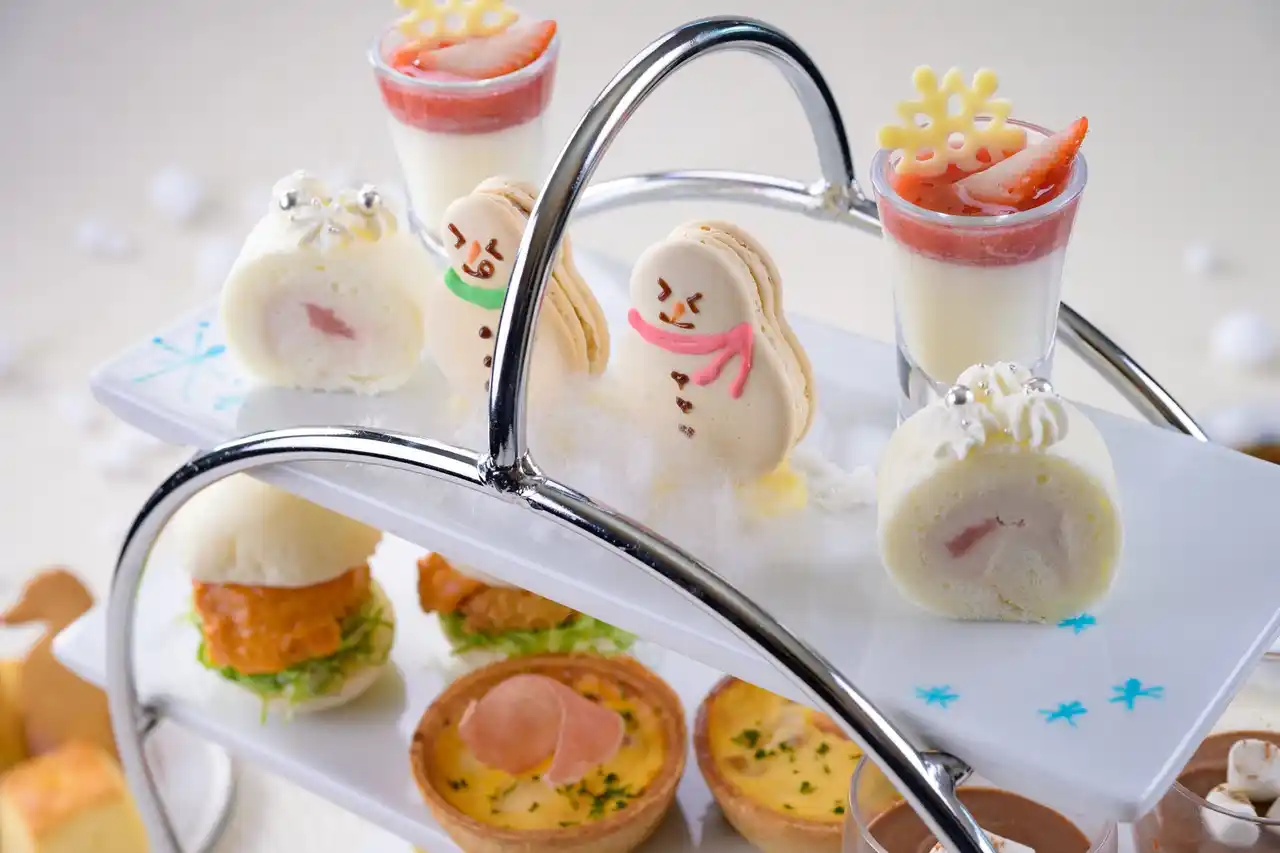 鳥羽国際ホテルのアフタヌーンティーは、その時期ごとに異なる趣向を凝らしたメニューが魅力で、多くのゲストから高い評価をいただいております。1、2月は、テーマを「雪だるまからの贈り物」にして、パンナコッタやロールケーキで表現した雪景色の中で、雪だるまが楽しむ様子を想像しながら、鳥羽国際ホテル自慢の伊勢海老ビスクスープをソースにしたクリームコロッケのミニバーガー、あおさ豚の生ハムチップが添えられたキッシュなど、多彩なスイーツやセイボリーを取り揃えております。また、英国式アフタヌーンティーでおなじみのスコーンには、チョコレートやストロベリーが入ったスコーンなど冬の訪れを演出しています。 |