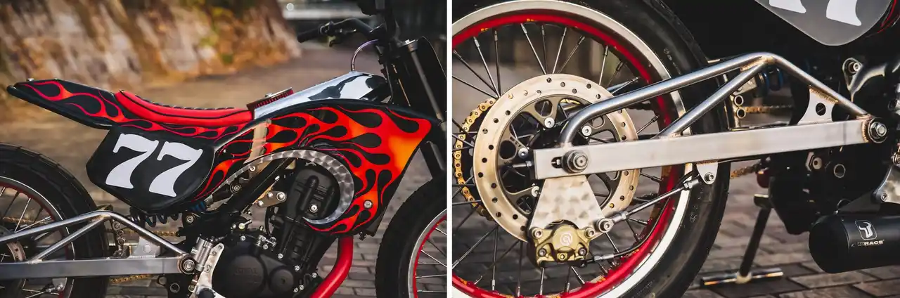 「Carolina Reaper」のコンセプトは、レトロとモダン、そして準レーサーとカスタムバイクの融合。1970年代のアメリカでフラットトラック選手権に出場していたフラットトラックレーサーや四輪のレーシングカーのような、真剣なレーシングマシンでありながら、遊び心を持ったアメリカンレーシングな車両を目指して製作されています。 |