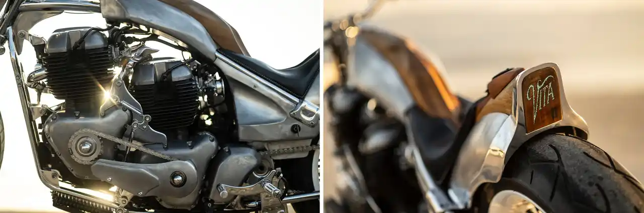 「VITA」最大の特徴は、CLASSIC 650の排気量648cc空冷4ストローク並列2気筒SOHC4バルブエンジンを2基搭載していること。前側エンジンのミッションを取外し、クランクケースを短く加工。前後2つのエンジンを、エンジン左側に配置したプライマリーチェーンによって連結しています。エンジンは、独自設計したハードテール・フレームに搭載。フロントには独自設計したクラシカルなスタイルのガーダーフォークを、26インチというモダンな大径ホイールをセットしました。モダンとクラシックの融合を果たしています。外装にはマホガニー材を使用。それとリンクする外装類は塗装を廃し、アルミの地肌と木目が美しくリンクしています。 |