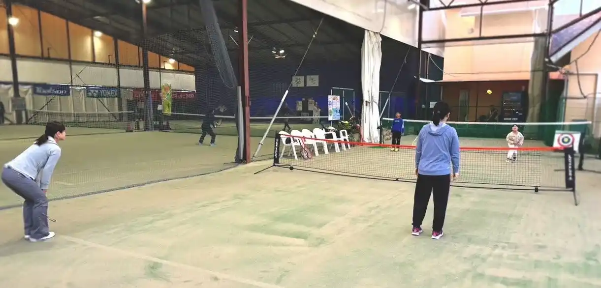 初心者でもたのしめるミニネット&ミニラケット、大きくてやわらかめのボールを使用します |