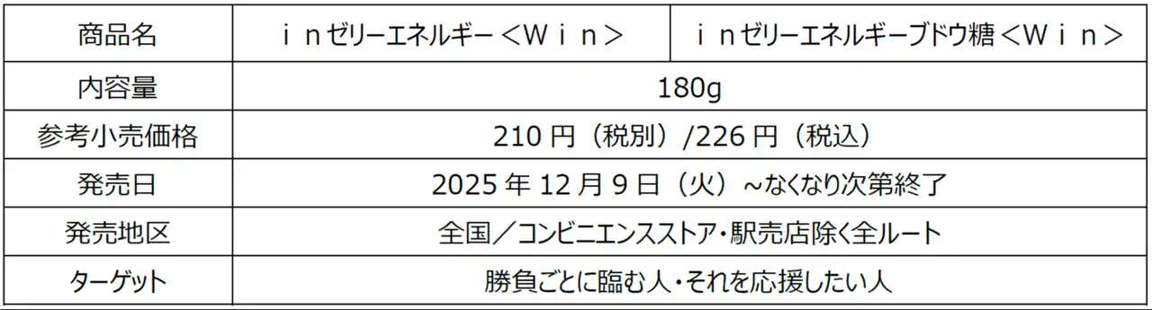 「inゼリー」ブランドは、受験や部活などのここぞという勝負事に挑む人たちを長年応援しており、「受験などの勝負ごとで、いつも隣にいる相棒でありたい、お守りのような存在でいたい」と考え、「inゼリー」の“in”を活かし、”Win”を訴求した特別パッケージ「inゼリーエネルギー<Win>」「inゼリーエネルギーブドウ糖<Win>」を2025年12月9日(火)より期間限定で再発売いたします。 |