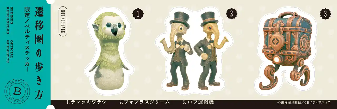 「遷移圏見聞録」に登場するキャラクターのオリジナル絵柄シールがもらえます。実施書店チェーンごとにステッカーの種類が違って、シールは2種類(Aバージョン・Bバージョン)になります。 |