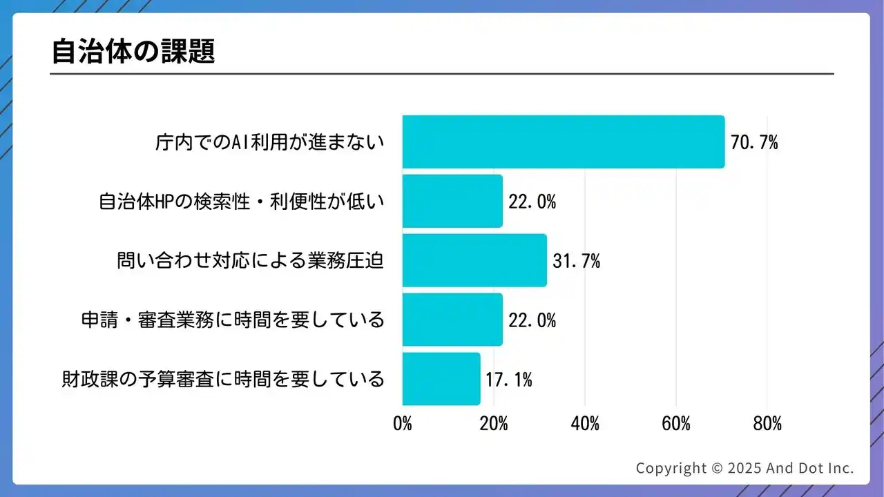 アンケートにより70.7%の職員が「庁内でのAI活用推進がなかなか進まない。利用されない」という課題を認識しており、生成AIの「導入」後の「浸透」と「実務での定着」が自治体DXの最大の障壁となっている現状が判明しました。 |