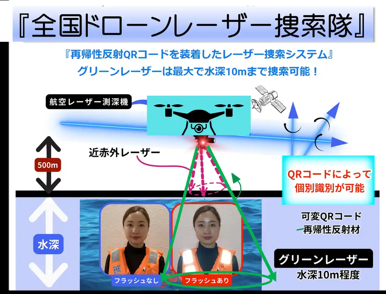 | NPO法人光探索協会(大阪市、理事長:前田佳伸)は、レーザー光と再帰性反射材を活用した「光探索システム」の研究開発および普及を通じて、海難および山岳遭難や災害時の人命救助支援に取り組む非営利団体です。同協会は、レーザー搭載ドローンを用いた捜索活動の実証実験を行い、再帰性反射材と可変QRコードを組み合わせた製品の開発を進めています。また、宇宙空間での反射実験も行い、将来的にはレーザー搭載人工衛星による広域捜索インフラの構築を目指しています。 | |||||||