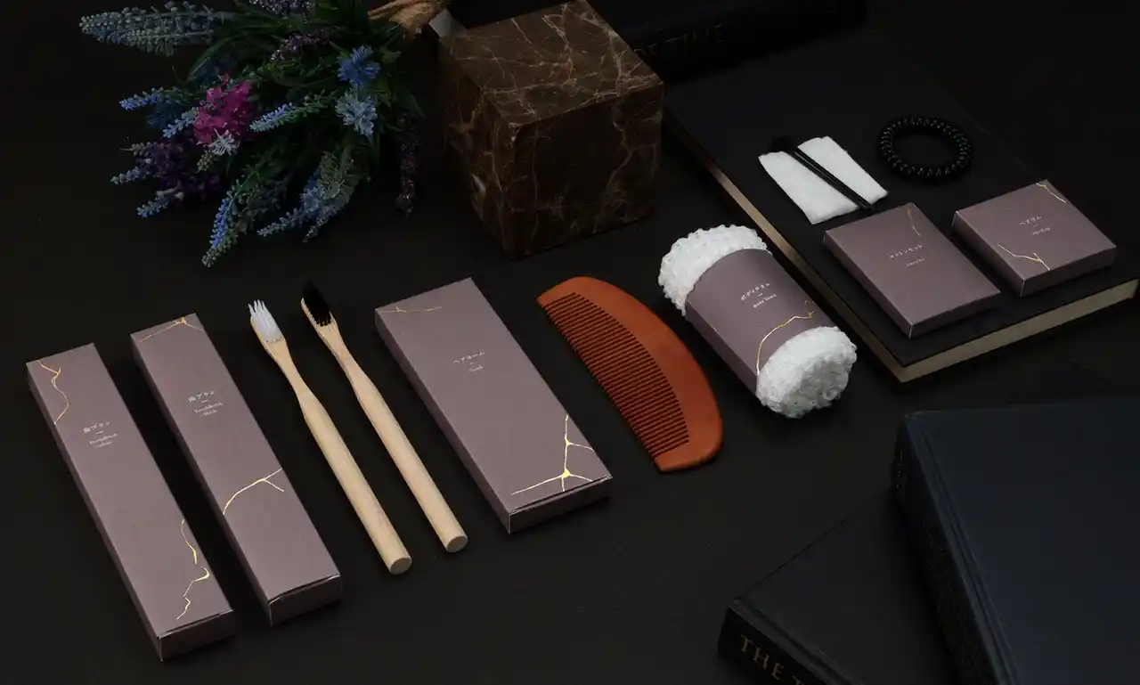 SUS amenityでは、竹やもみ殻などの自然素材を活用したアメニティシリーズを多数展開中。なかでも今回発売の金継ぎシリーズは、高級感を演出できるラインとなっています。 |