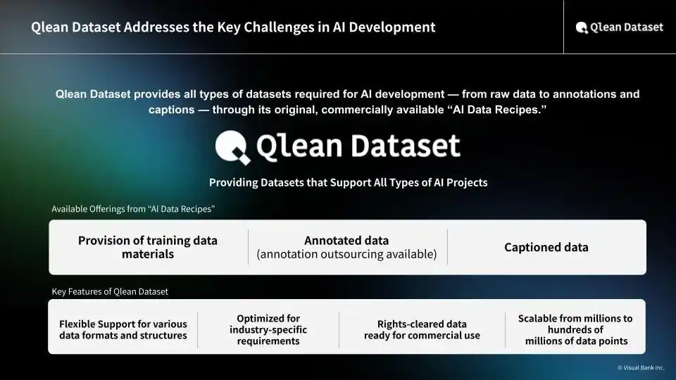 ▶ Qlean Dataset: https://qleandataset.visual-bank.co.jp/en ▶ AI Data Recipe: https://qleandataset.visual-bank.co.jp/en/lineup