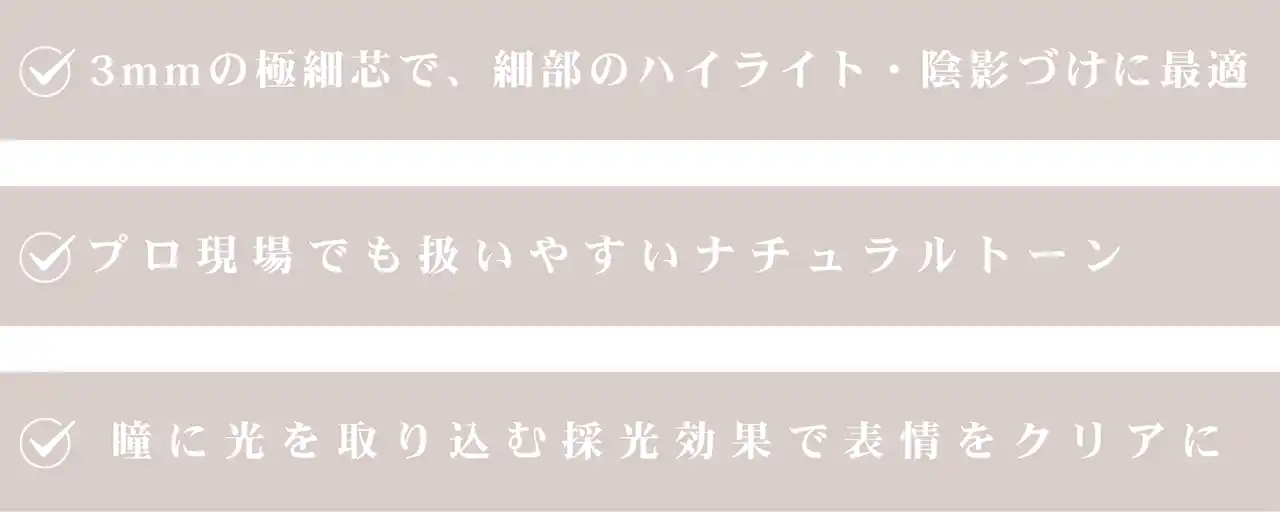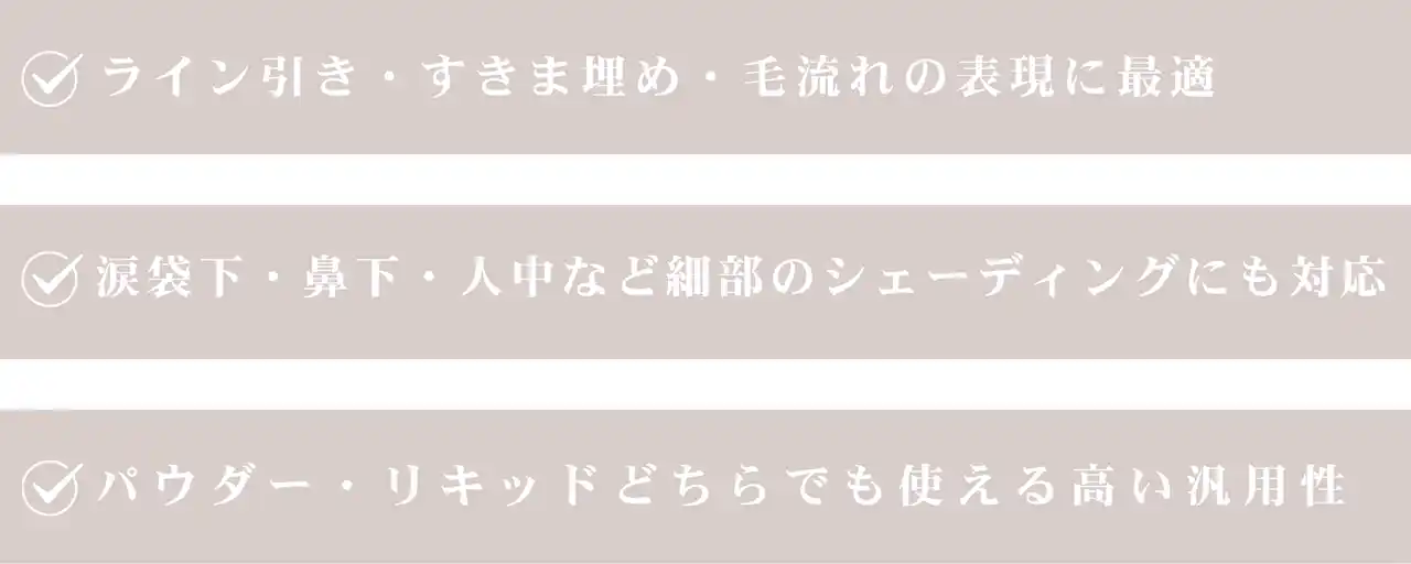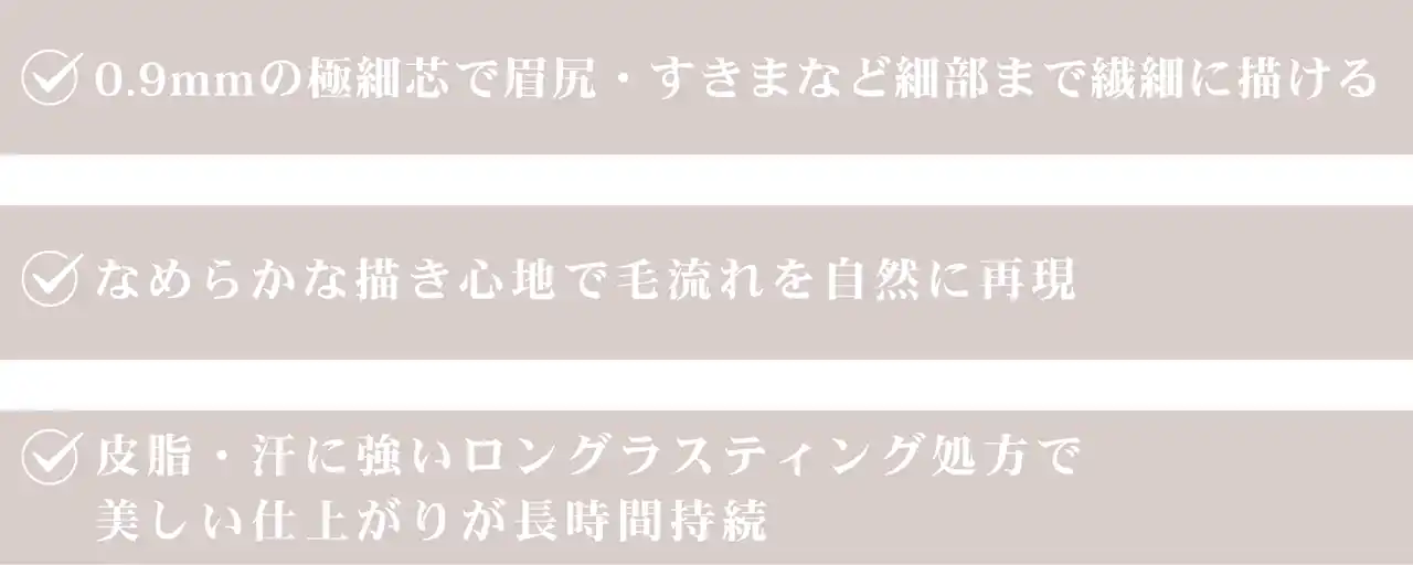 | 極細の筆先が眉の細部まで正確に捉え、繊細かつ自然な仕上がりを実現します。 | |||||||||||