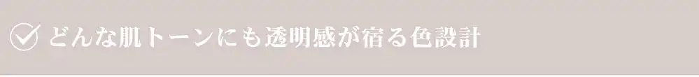 イエベ/ブルベを問わず、あらゆる肌トーンの上で"透明感"が生まれる絶妙な色バランス。 「爽やかさ・清潔感・透明感」を基準に、何度も調色を重ね完成しました。 特にハイライトは発売直前まで微調整が続いたほどのこだわり色です。 |
