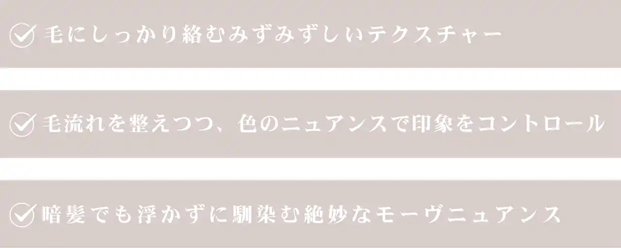 くすみすぎない抜け感のあるモーヴブラウンが新登場。 黄みにも赤みにも寄らない、ブラウンにグレーを一滴落としたような"淡く透ける上品なカラー"で、眉に旬のニュアンスをプラスします。 みずみずしいテクスチャーが毛1本1本に絡み、自然な毛流れを整えながら色そのものがまなざしを静かに引き締めます。 |