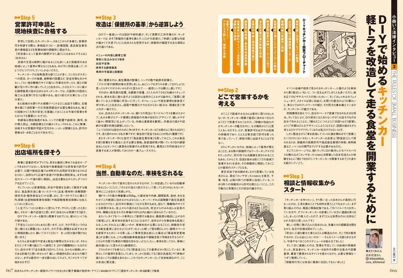 リノベ・小屋・キッチンカー、3つのセクションごとに、先駆者が語る開業インタビューを展開。資金計画・補助金制度の活用法から、営業に必要な許可申請や届け出、資格所得まで、それぞれのビジネス開業までのフローをていねいに解説します。その他、複数のスモールビジネスを掛け合わせたユニークなコミュニティや手作りマルシェの紹介も収録。 |