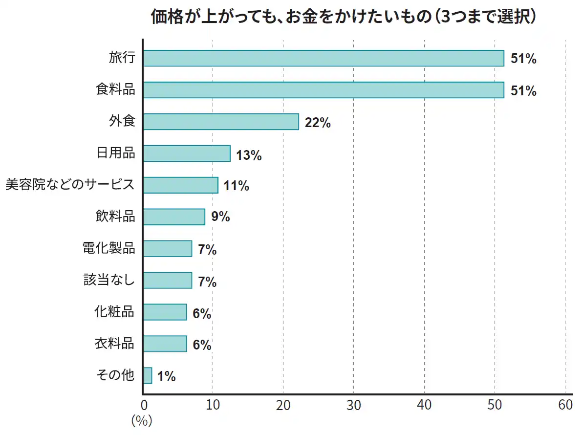 価格が上がってもお金をかけたいものは、「旅行」と「食料品」がともに51%と突出。食料品は、TOPICS1の「現在、節約しているもの」という質問でもトップとなっており、節約の一方で信頼・安全性が重視される点から、メリハリ消費が意識されていることがうかがえます。 |