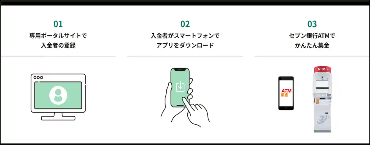 | セブン・ペイメントサービスが提供する「ATM集金」は、専用スマートフォンアプリを用いて、セブン銀行ATMで原則24時間365日、売上金を入金できるサービスです。 | |||