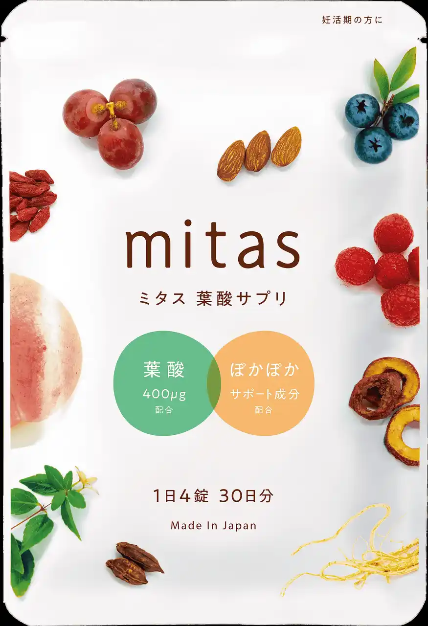 胎児の神経管閉鎖障を予防することから、葉酸は妊娠前後に摂取することが望ましいとされています。ミタスは、厚生労働省の定める葉酸400㎍を配合しているほか、鉄分・ビタミン・ミネラルを30種類以上、更に和漢素材配合なので温活力で妊活の大敵である冷えもケアします。 |
