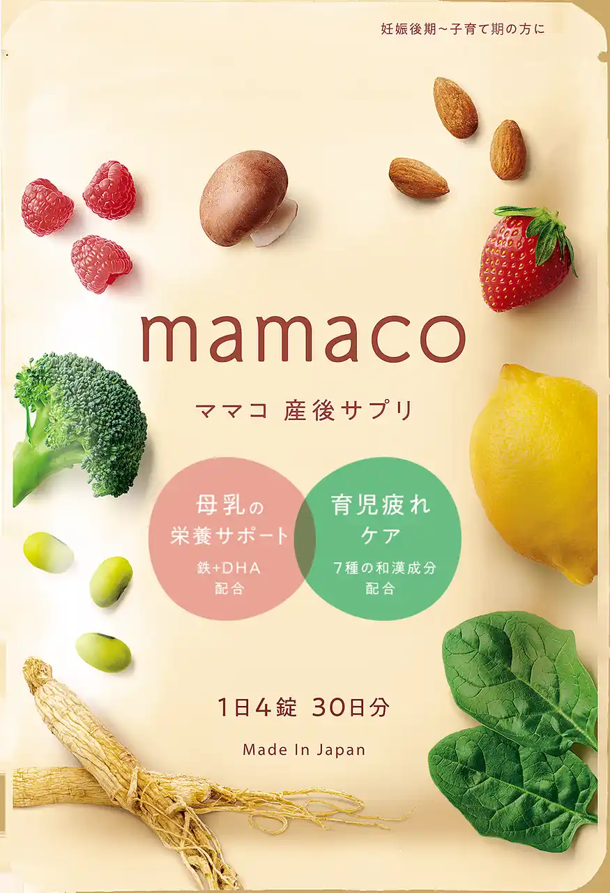 『mamaco(ママコ)』は産後・授乳期の女性に向けた「史上初*母乳の栄養補給と育児の体調ケアのための産後サプリ」です。 |