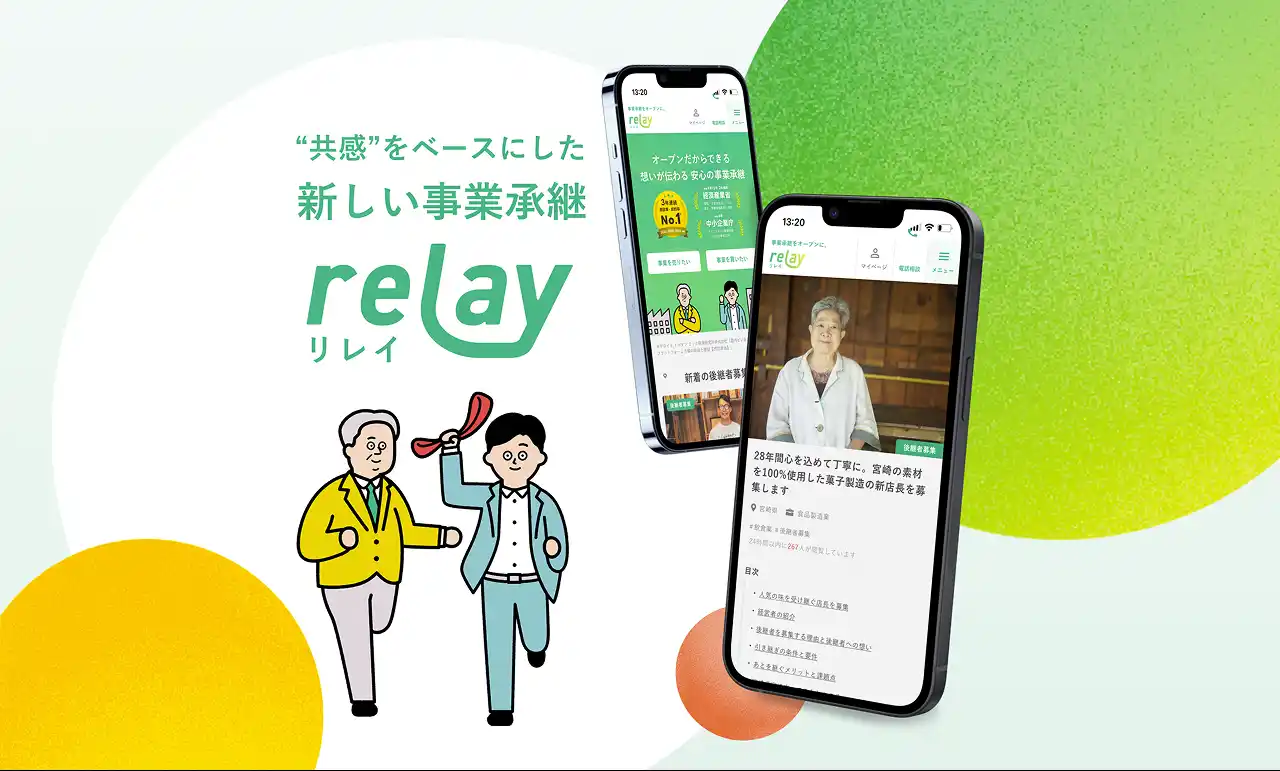 オープンネーム事業承継「relay(リレイ)」は、従来社名や企業情報が伏せられてきた事業承継のマッチングをオープンネームで行い、経営者が事業に込めてきた想いをストーリー化し掲載。これに応じる熱意ある後継ぎ候補を広く公募することで、共感をベースにした新しい事業承継の形を打ち出しています。2020年のサービス開始以降、約800件の後継者募集案件を公開、約160件のマッチングを生み出してきました。 |