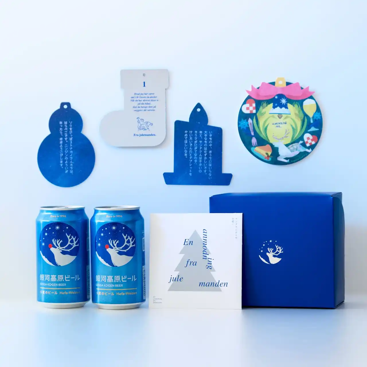 セット内容 :オーナメント型メッセージカード(全6種)、 赤鼻シール付き「銀河高原ビール 小麦のビール」(2本)、 |