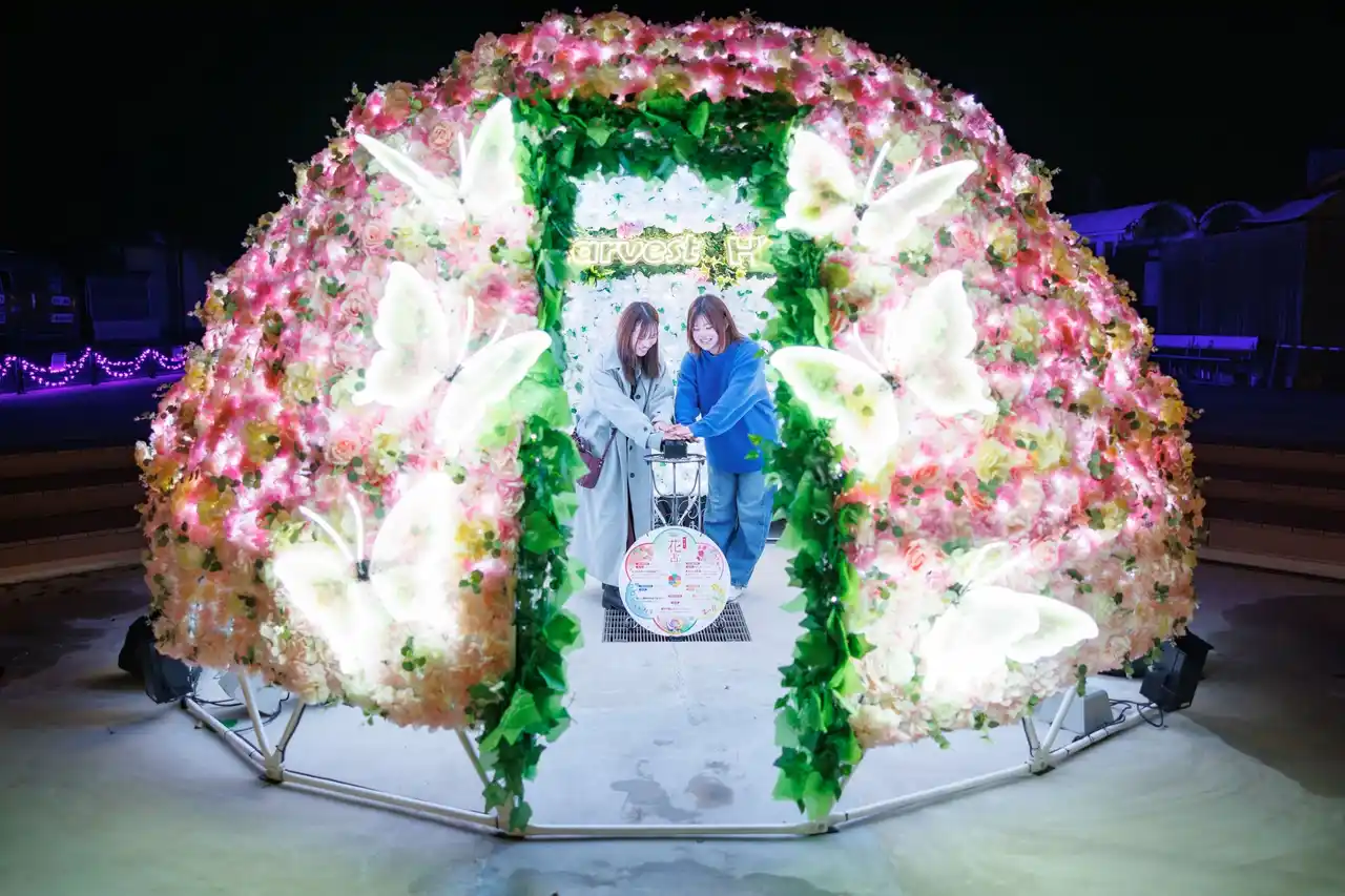 エリアの最上部にはフラワードームがあり、中にあるボタンを押すと光の演出が始まります。演出の最後には、ハーベストの丘に咲く花にちなんだ色に変化し、その色に込められた花言葉に沿って花占いの結果を楽しむことができます。 |