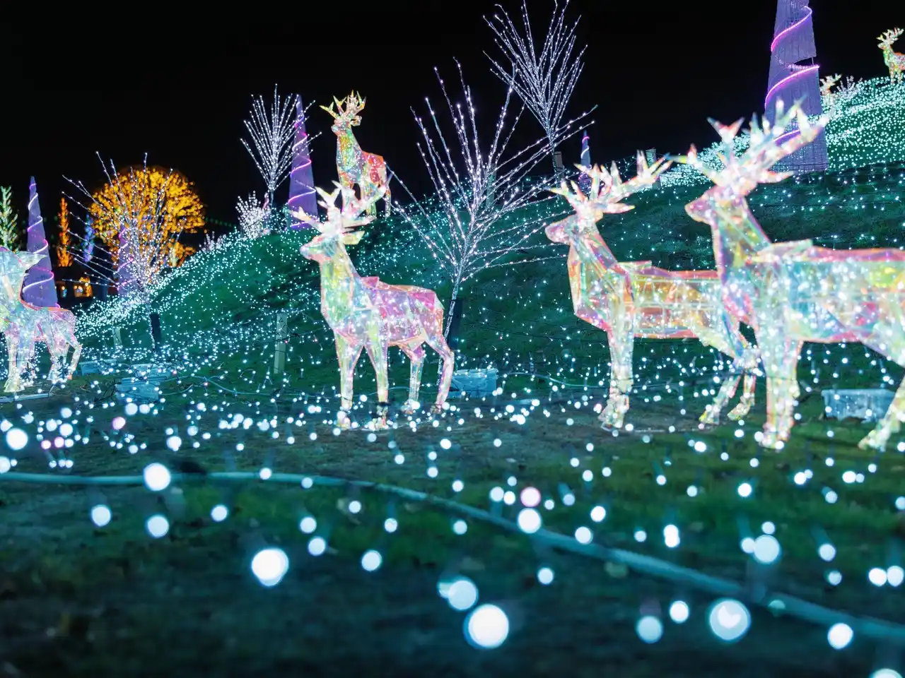 透明感のあるトナカイのオブジェが、見る角度によって色を変えながらキラキラと輝く幻想的なエリア。足元に広がる光の粒とともに、氷の世界に迷い込んだような景色を楽しめます。 |