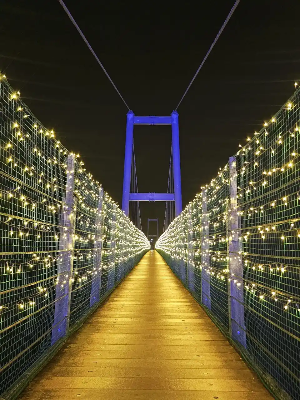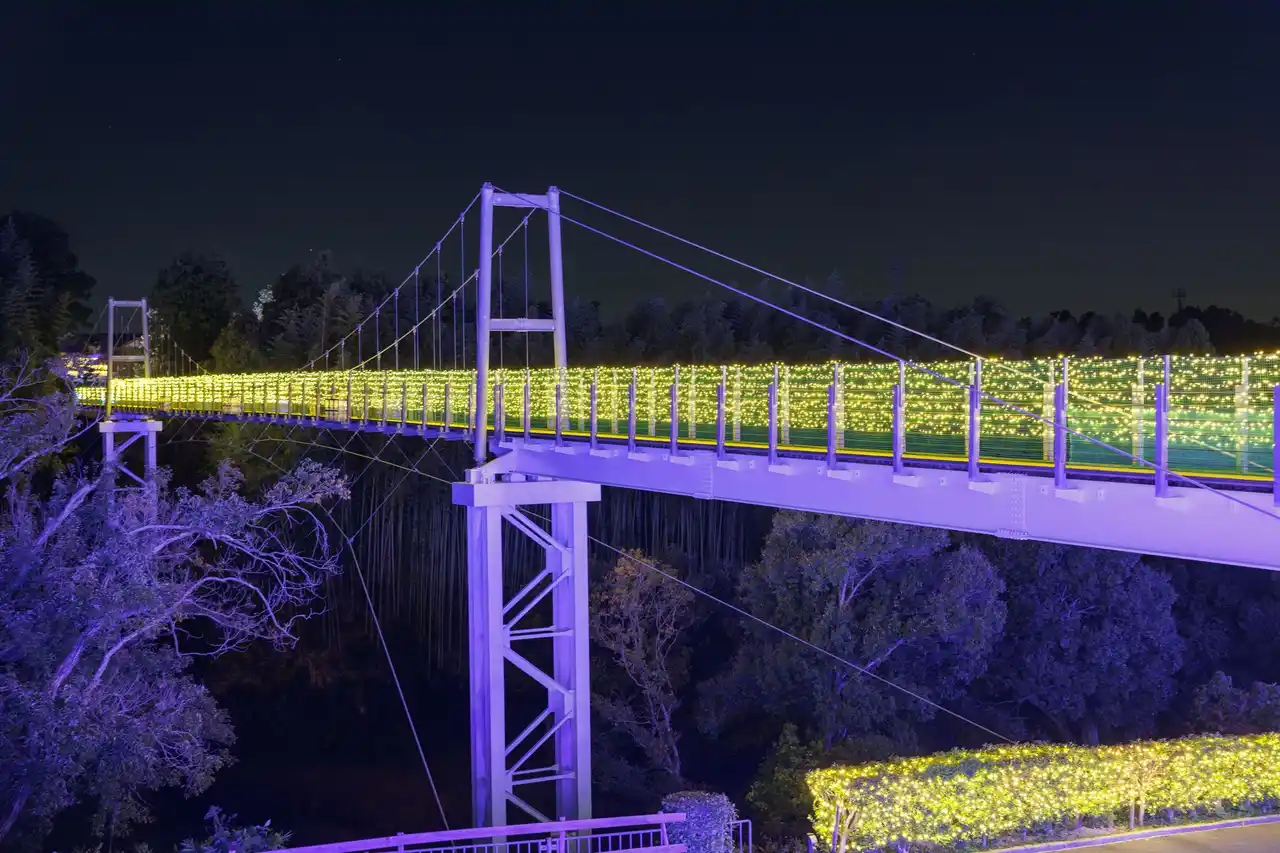 眩しいくらいに光る吊り橋は、渡り始めるとまるで光に包まれたような体験ができ、また一直線に伸びる光のラインは外から見ても美しく、訪れる人々の目を引きつけます。 |