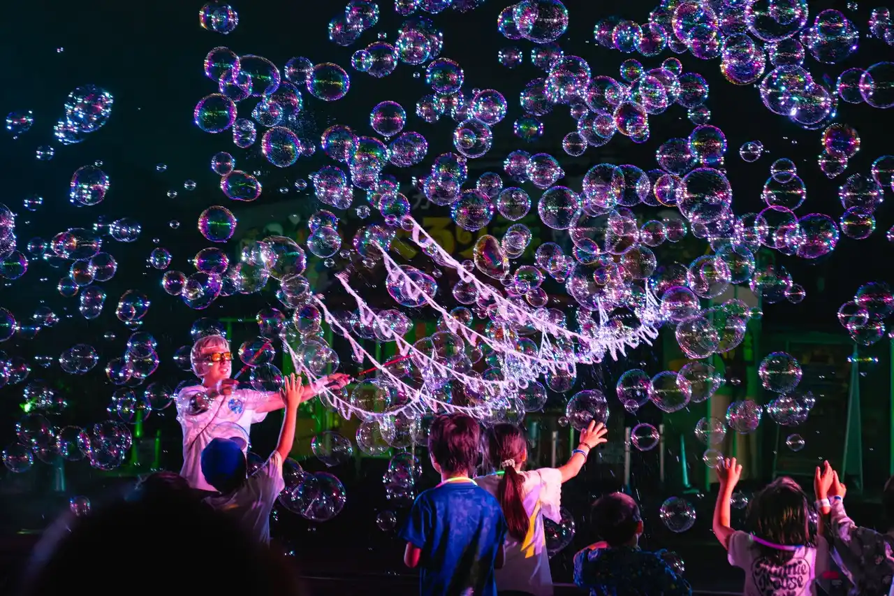 ライトに照らされたシャボン玉が七色に輝き、まるで星が生まれては消えていくような幻想的な空間が広がります。自然と笑顔になれる美しい光景は、世代を問わず誰もが夢中に。 |