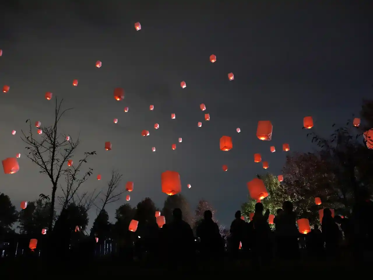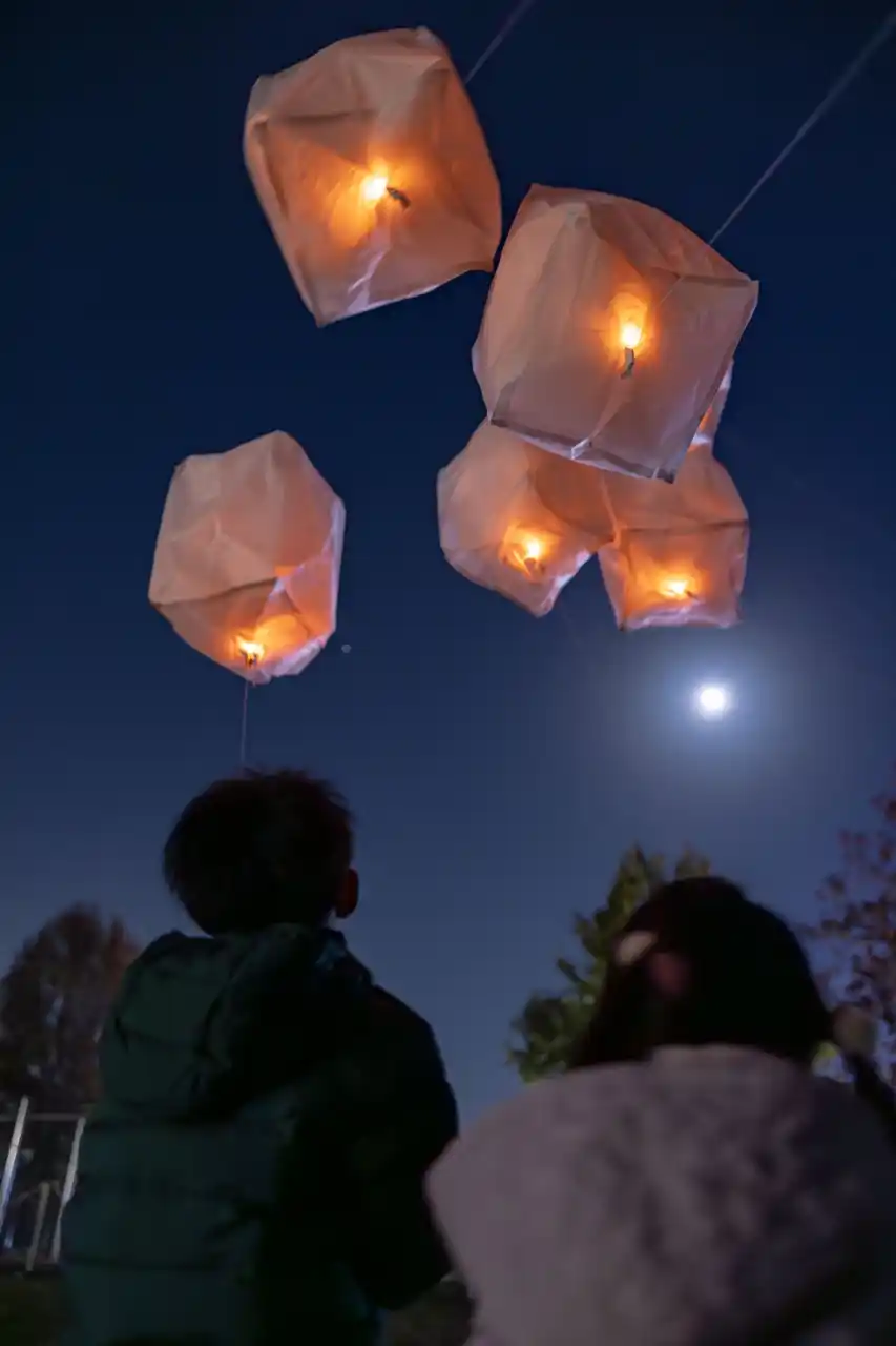 夜空にふわりと舞い上がる無数のスカイランタン。手のひらから放たれた小さな灯りが、夜空いっぱいに広がる幻想的な光景を生み出します。 |