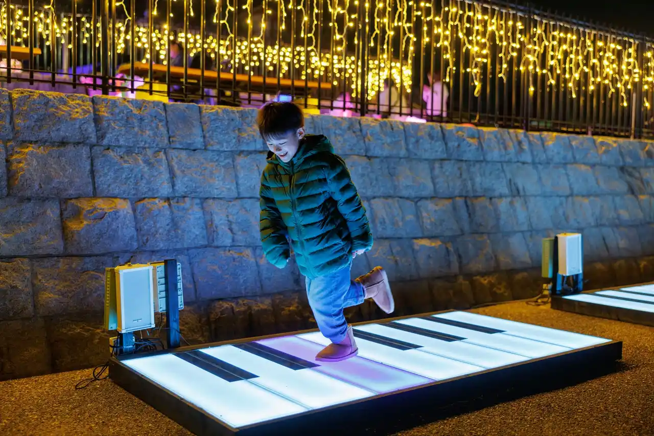 お子様も楽しい光る遊具を集めました。踏むとその鍵盤の音が鳴る光るピアノや様々な音がなる光るプレート、光るシーソーなど光と音の演出を体験しながら遊べます。 |