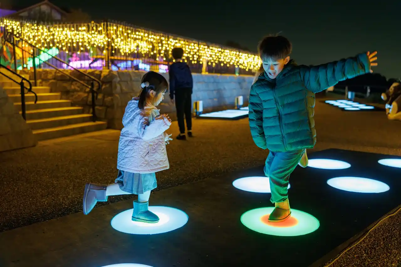 光るカピバラやヒツジたちが皆様をお出迎え。高さ15m以上の煌めくセコイアツリーやレインボートンネルなどのフォトスポットの他、光るシーソーや音の鳴る光のステップなど体験型の演出も盛りだくさん。芝すべりやおもしろ自転車・観覧車など一部遊具アトラクションもライトアップして営業を行っています。 |
