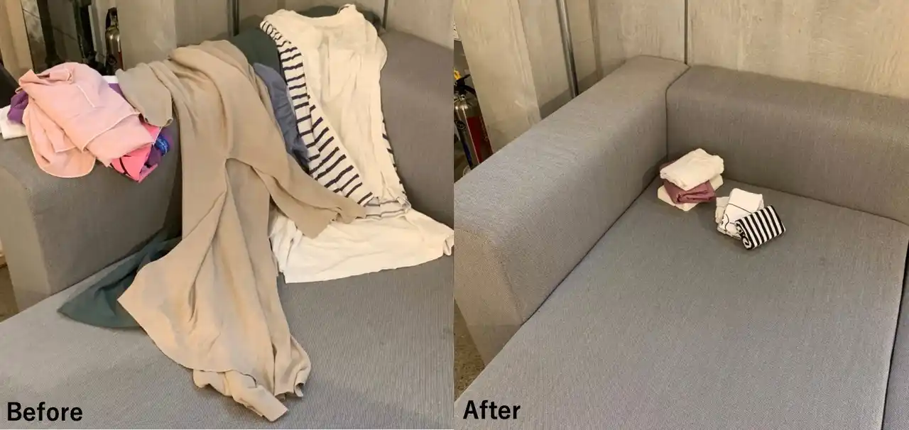 空港内のパッキングエリアやベンチなどで荷物の入れ直しをする際、着用後の衣類が手のひらサイズに小さく圧縮されることでスムーズに整理ができ、ストレス軽減や効率の向上に貢献します。 |
