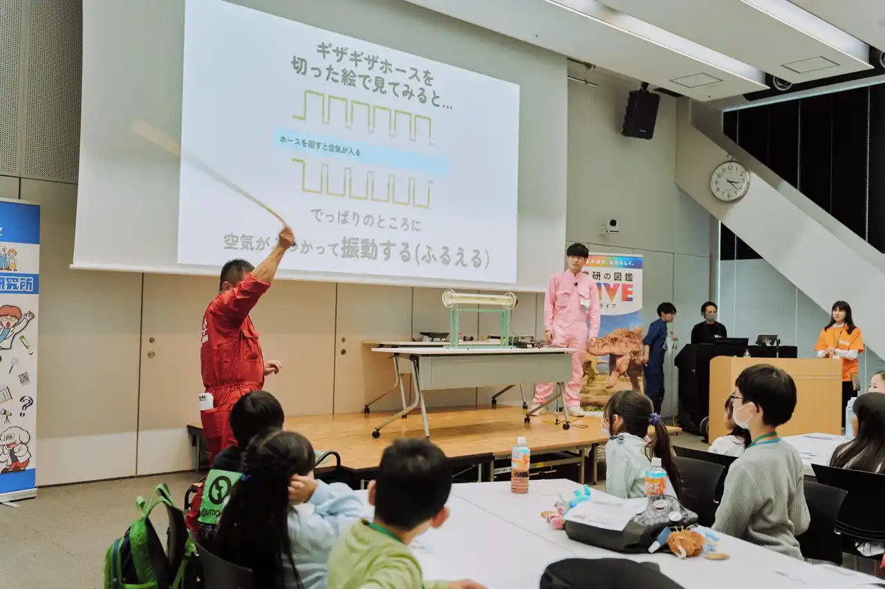 | 編集部研究員ダイタナといがぐりによる、参加型の実験ショー。ホースを回転して音を出す実験や、声の振動で模様が現れる実験などを通して、音の世界のひみつに迫ります。実験が成功するたびに子どもたちから大歓声があがりました。最後は、ストローで作った笛をみんなで演奏しました。 | ||||||||||||||||