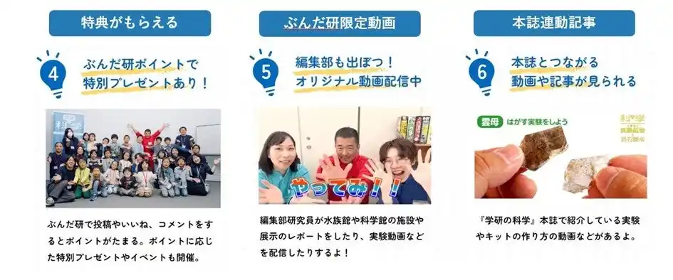 | 「学研の科学 あそぶんだ研究所」は、読者と編集部がいっしょになり、科学を楽しむ無料のオンラインコミュニティ。編集部による生配信のワークショップに参加できたり、キットの遊び方をみんなで投稿したり、ここでしかできないオンライン体験がもりだくさんです。小学生たちのSNSの入門としても保護者から信頼されているコミュニティサイトです。 | ||||||||||||||||