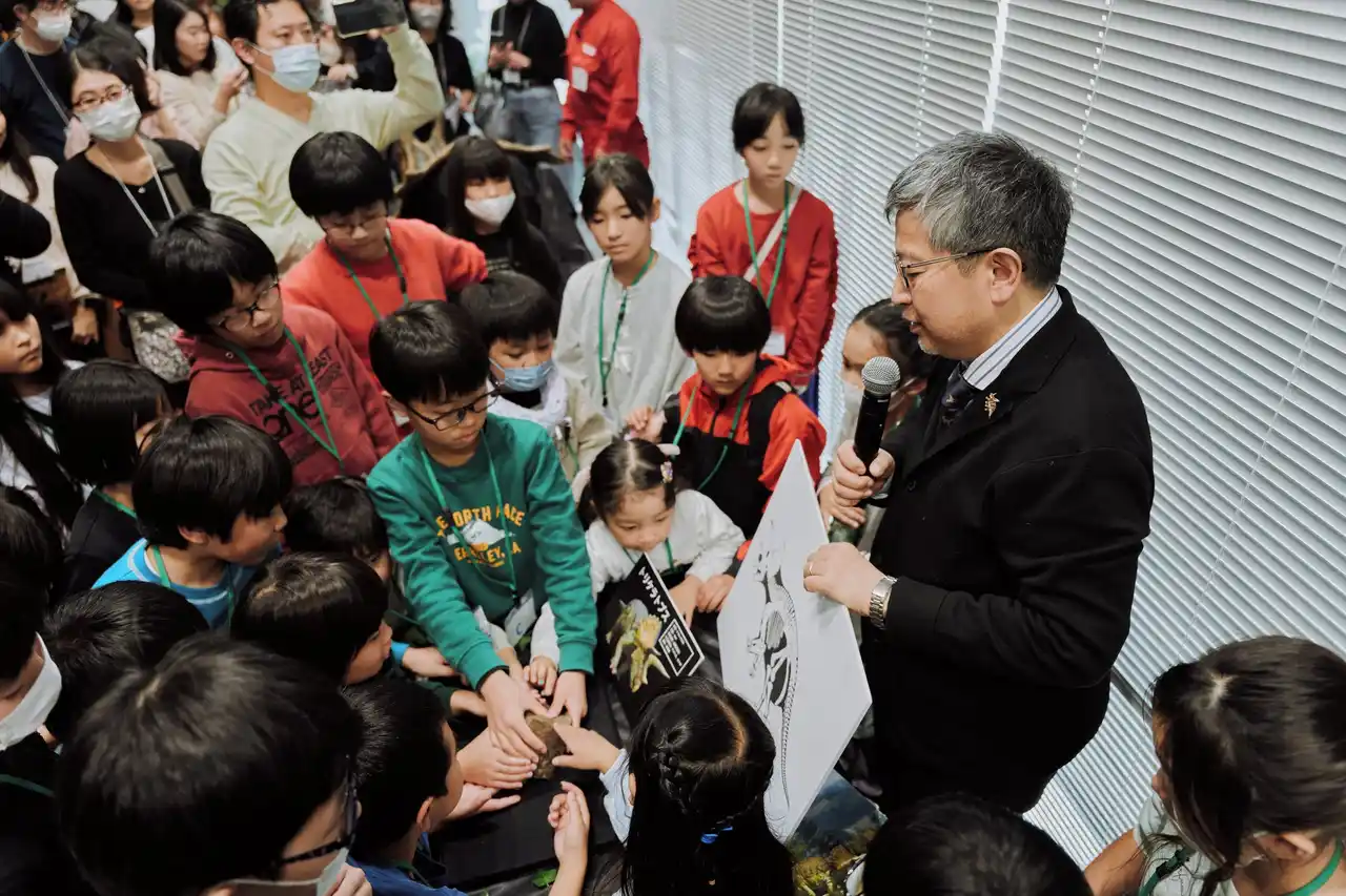 | 恐竜博士・真鍋 真先生が特別館長を務める、群馬県立自然史博物館からお借りした本物の化石や標本全6点を間近で見ながら、真鍋先生の生解説が聞けるスペシャルプログラム。子どもたちは化石の表面や形をじっくり観察。化石に触れて、凹凸や質感を肌で感じる体験も。教科書では分からない本物の手ざわりに、子どもたちは夢中になっていました。 | ||||||||||||||||