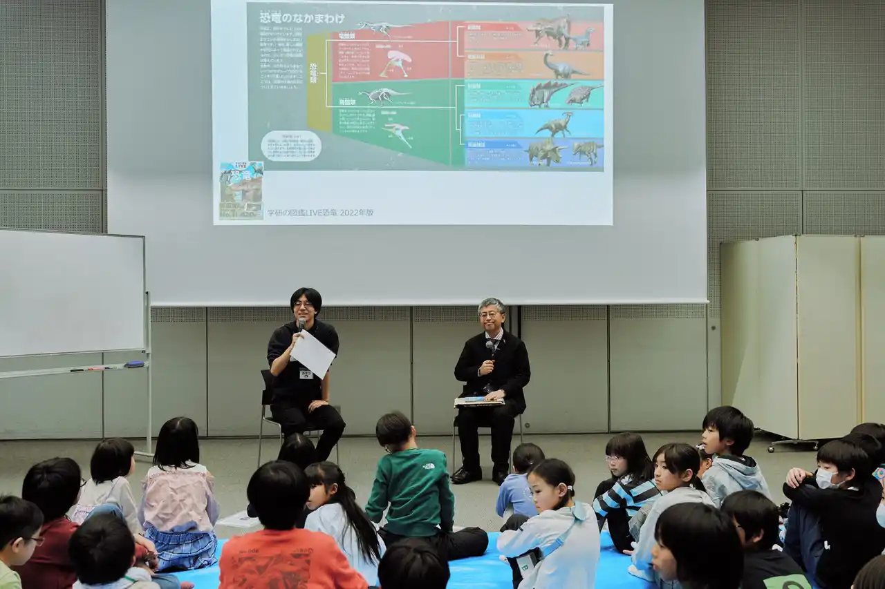 | 博物館ツアーの後は、真鍋先生によるスペシャル座談会。最新の恐竜研究、研究者のお仕事の裏側など、ここでしか聞けない話が盛りだくさん。子どもたちは目を輝かせて聞き入っていました。 | ||||||||||||||||